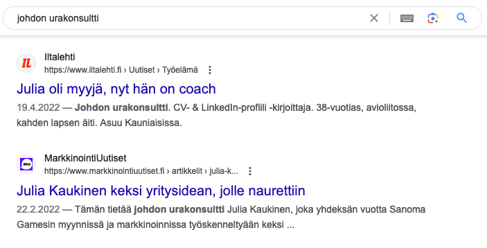 Julian yritys, Kaukinen Consulting Oy, tekee johdon urakonsultointia ja hänen kaksi haastatteluaan ovat Googlen etusivulle etsiessä termillä “johdon urakonsultti”.