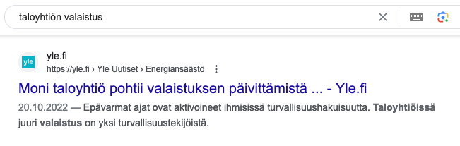 Juhan yritys, Valoram Oy, tekee taloyhtiöille valaistuksia, ja hänen haastattelu Ylellä nousee etusivulle, kun Googlesta etsii avainsanalla “taloyhtiön valaistus”.